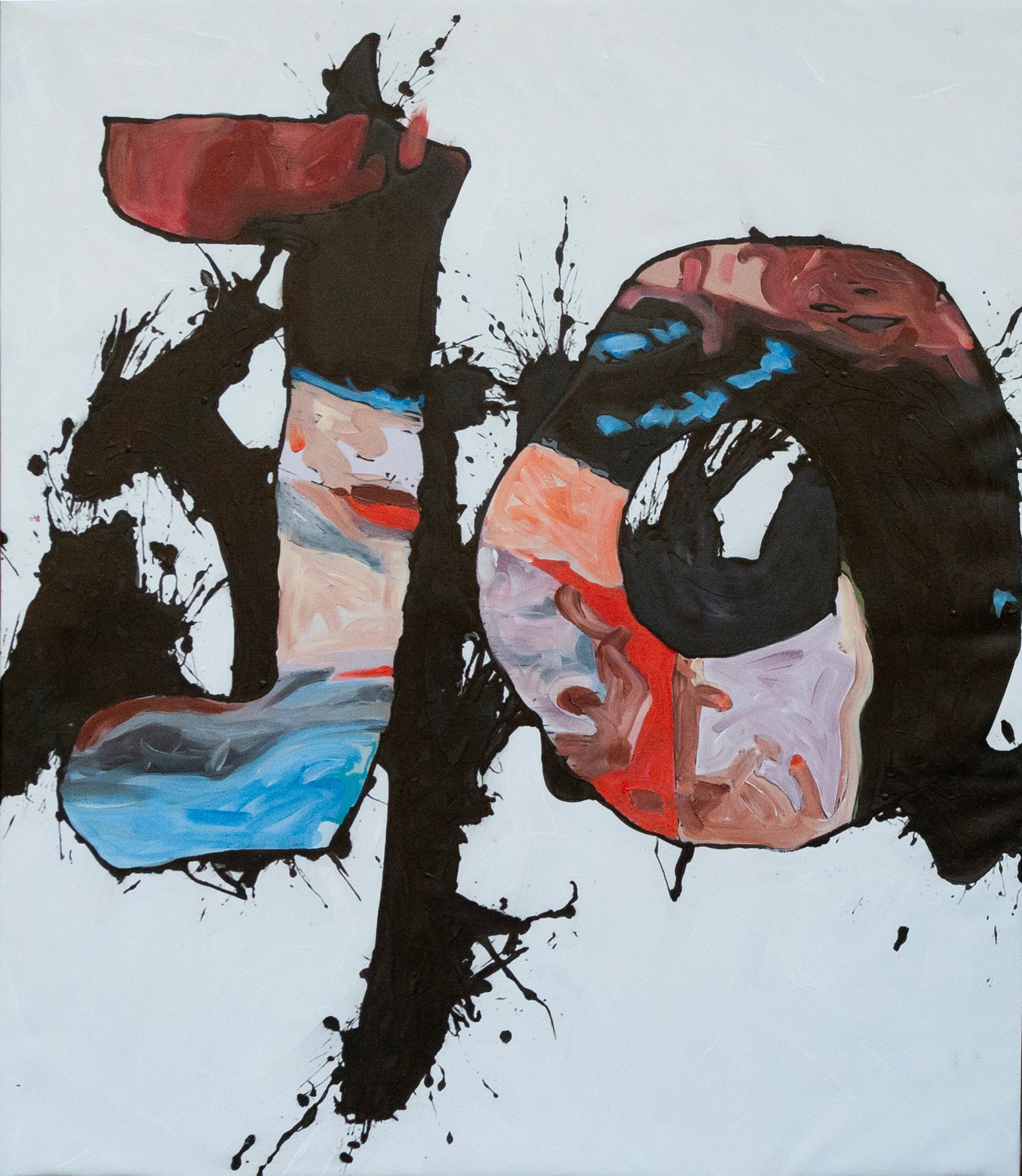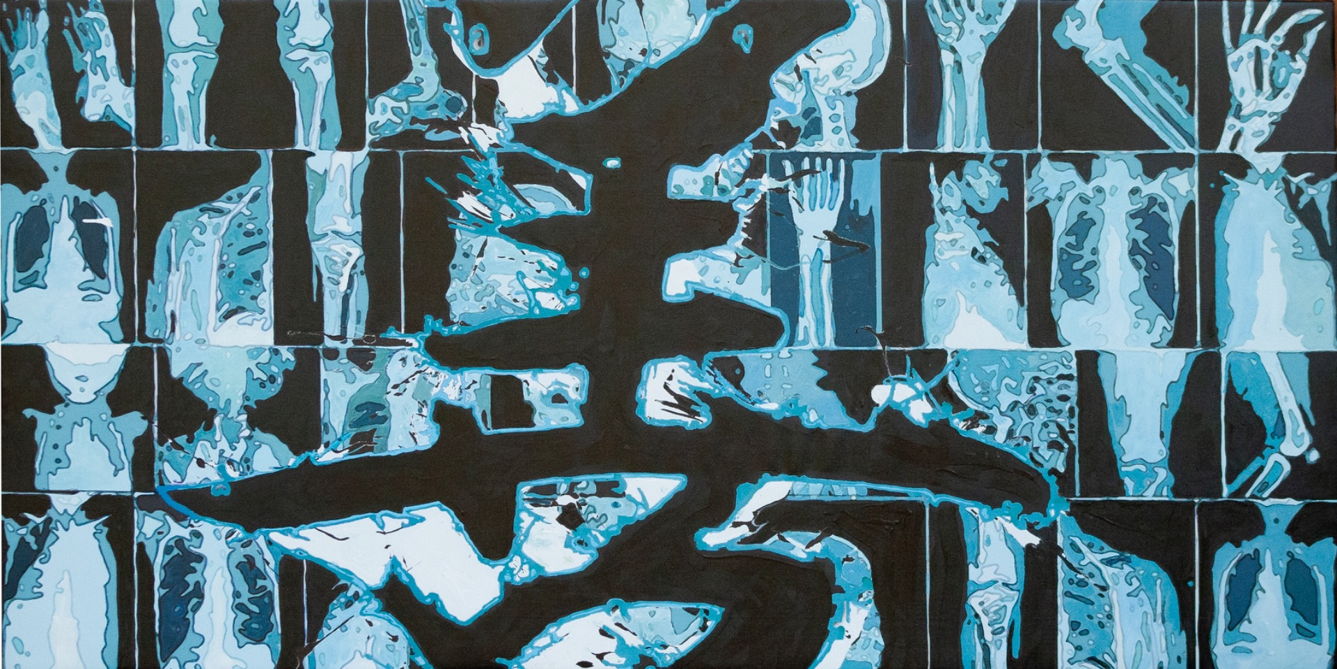 This work was conceived as a large comic strip. A background of stylized, cartoon-like X-rays sets the stage for a bold, sweeping black shodou mark. It is a 150 × 200 cm mixed-media painting on canvas.