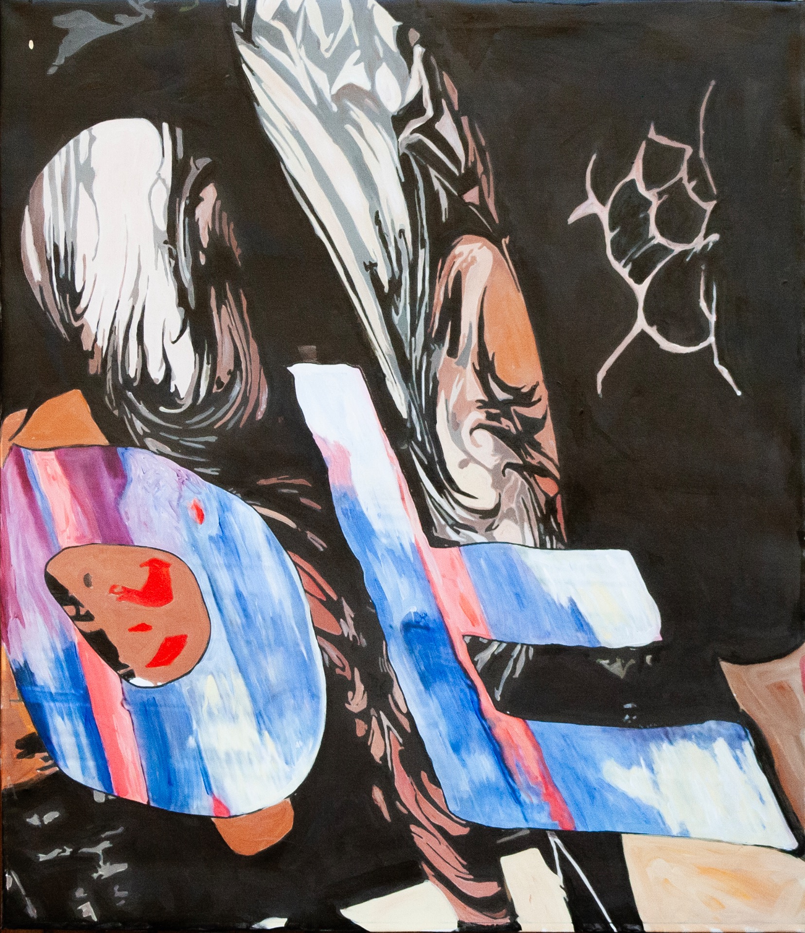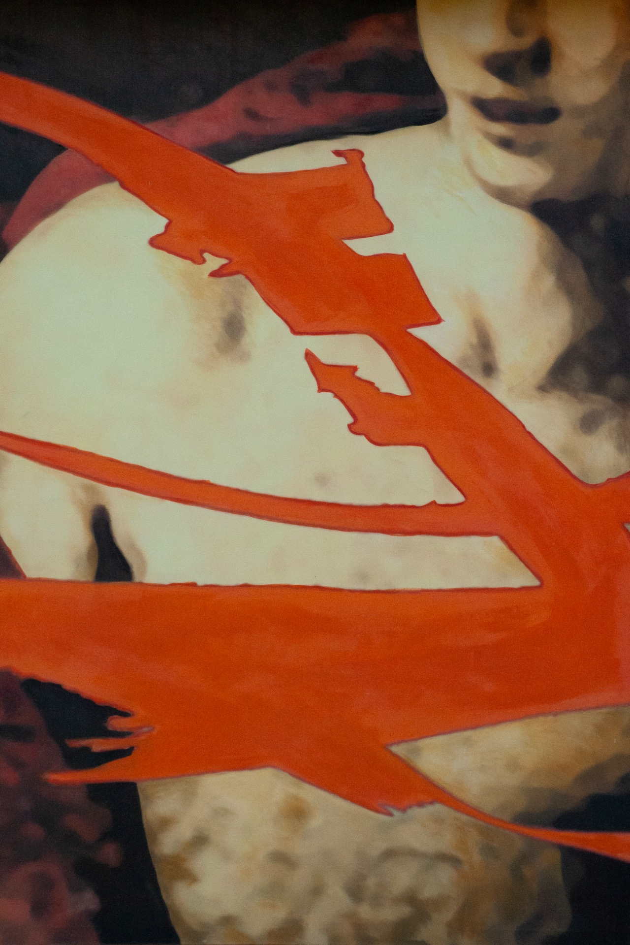 This large portrait of a young man recalls 16th-century painting; it draws on our Mannerist tradition, which remains embedded in our practice. How can we, as moderns, relate to such harmony and beauty except by attempting to disrupt it? The red-orange disfigurement does not negate the figure — it amplifies it.
