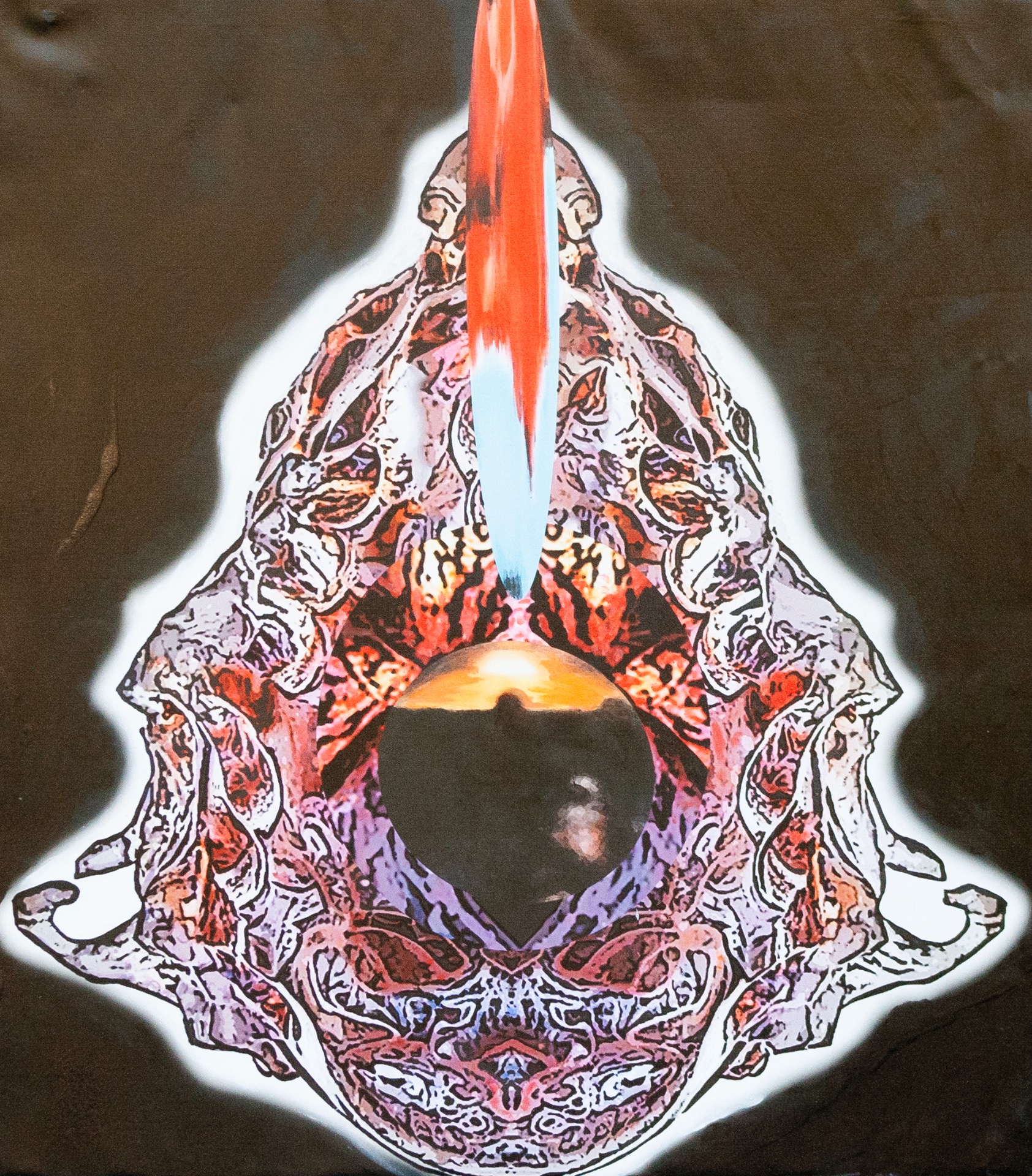We found a glass talisman with a shape reminiscent of a heart or a uterus. Its surface reflected many colors, and we placed it within a bodily niche that vaguely resembles an X-ray of the pelvis. We were interested in highlighting this mysterious and profoundly generative part of the human body.
