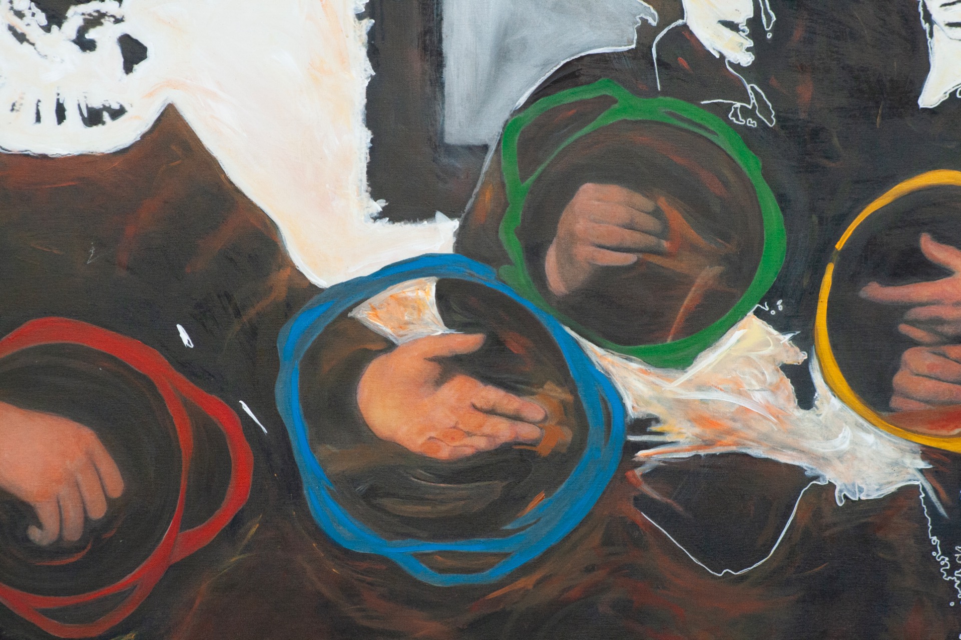 This large painting reflects on contemporary realities by combining human forms conceived as targets. In the foreground, the canvas containing the target is pierced by bullet holes. The figure in front covers the mouth of the figure behind it, which appears like a human X-ray. It is a juxtaposition of evocative forms that recall conflicts and acts of aggression against humanity.
