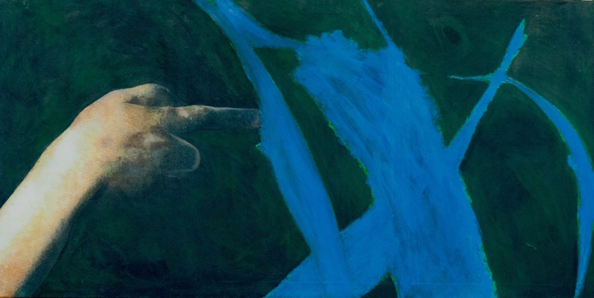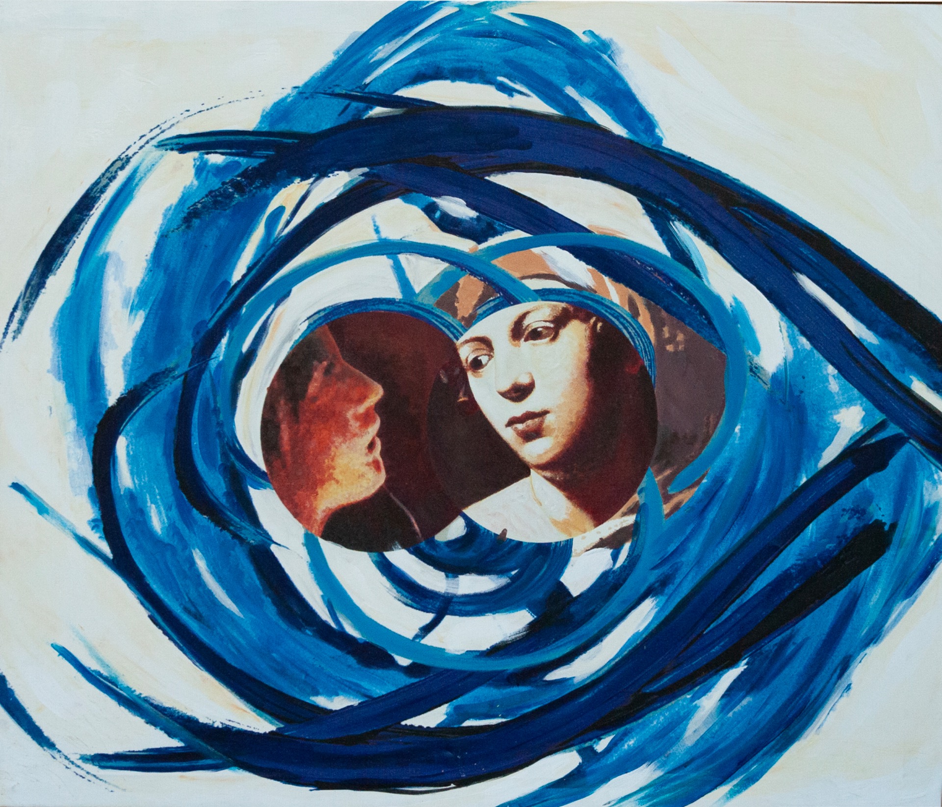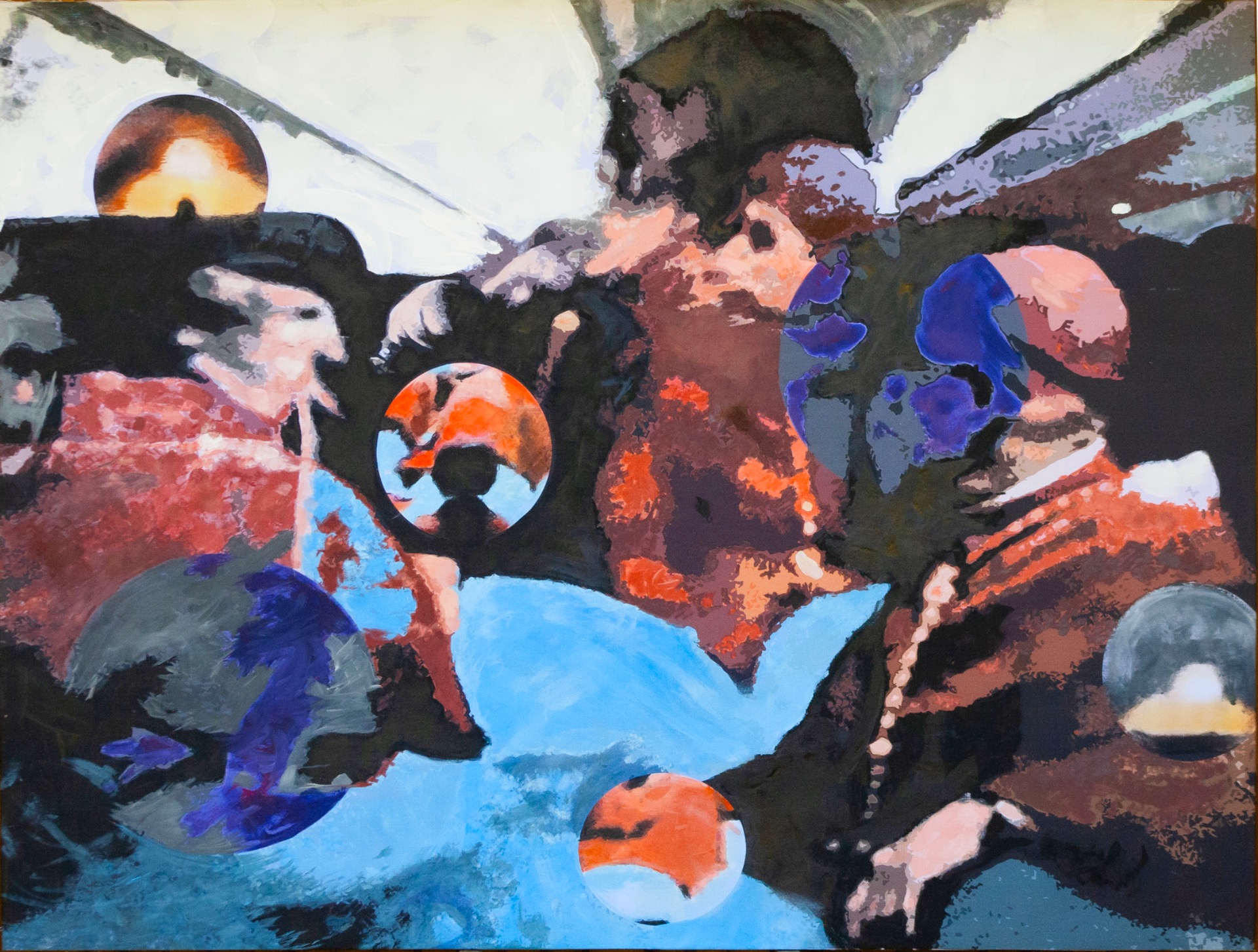 This painting was born from a game. During a long, boring flight to Antiparos, we were watching a movie and began photographing the images on the screen as they overlapped with our own reflections. We later processed many of these photos and redrew several parts of them until we achieved a vibrant effect, enriched by particularly evocative foreground images.